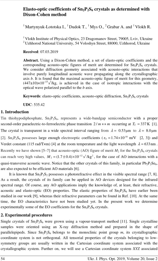 Mys O, Martynyuk-Lototska I, Grabar A and Vlokh R 2009. Acoustic and elastic